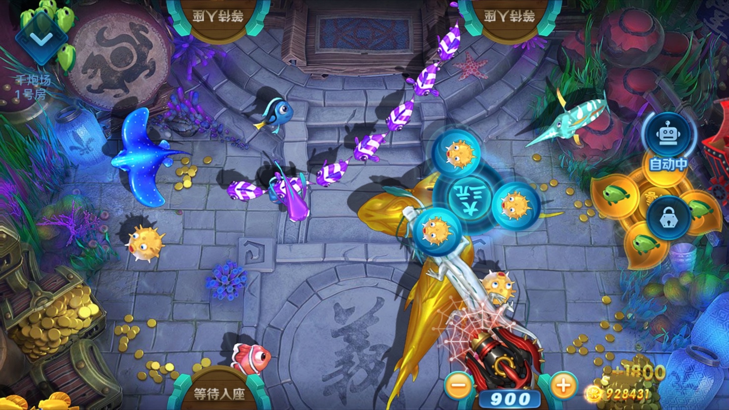 当你看到鱼阵来的时候千万不要看到数量多就立马就疯狂射击。你要需要选好角度,不要被小鱼拦住道路。不然你射击的时候很容易被小鱼拦住,既浪费子弹,又浪费机会。如果不想打鱼阵,也可以好好利用这个时间占位休息。